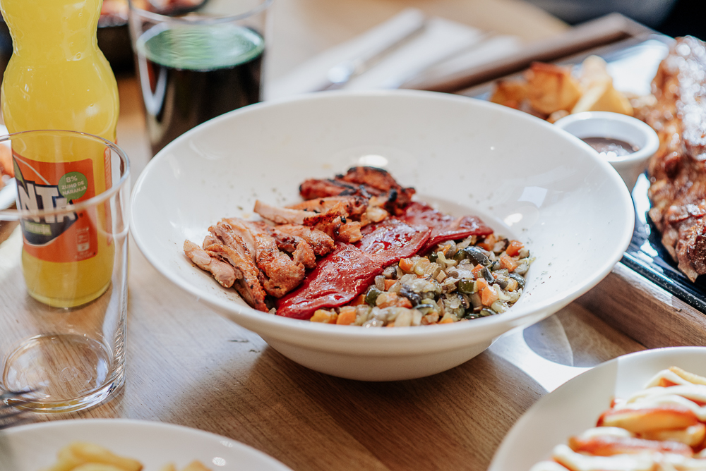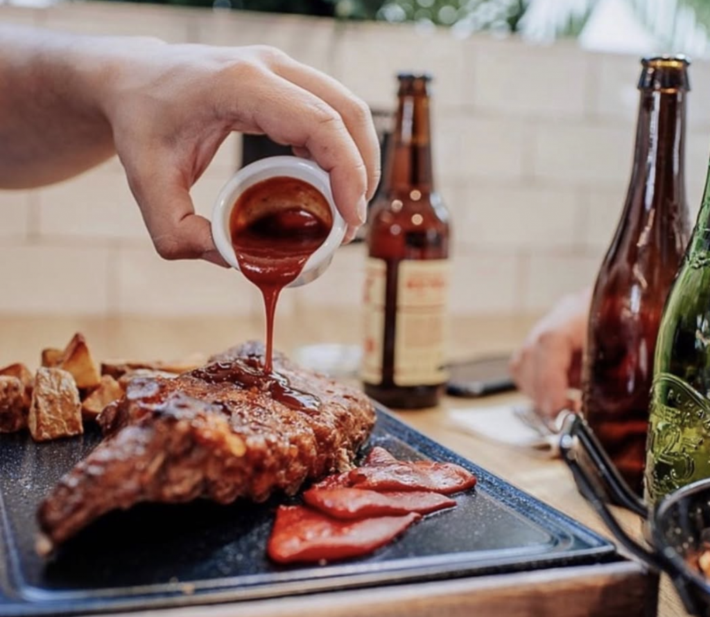 De cerdo, asada a baja temperatura y acabada en nuestra parrilla. Acompañado de salsa kentuchy bourbon.
