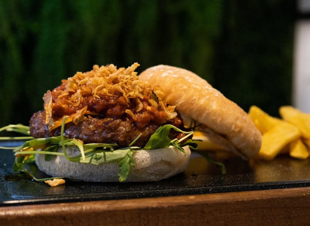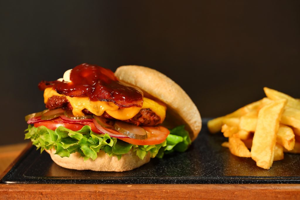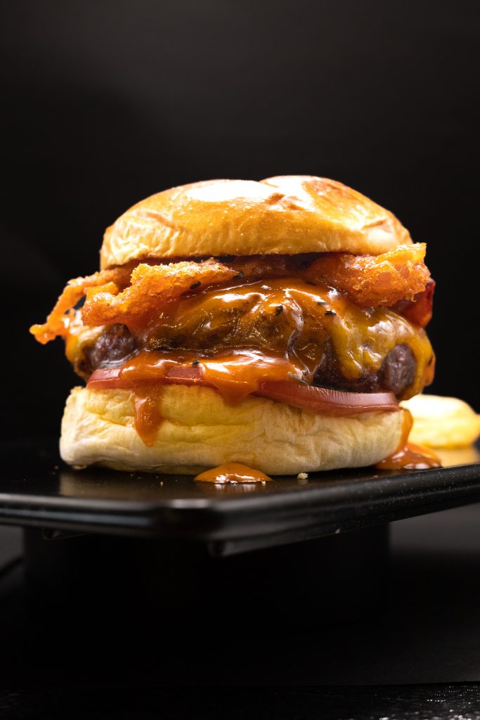 Carne a elegir, pan brioche, pepinillos agridulces, doble de queso cheddar,  tomate, aros de cebolla crujientes, bacon crujiente y nuestra salsa Emmy.