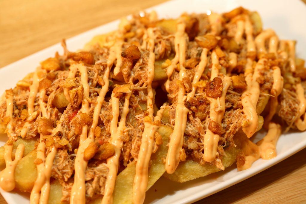 Pulled pork, maíz crujiente frito, mojo de lima, mayo syracha y polvo de kikos.
