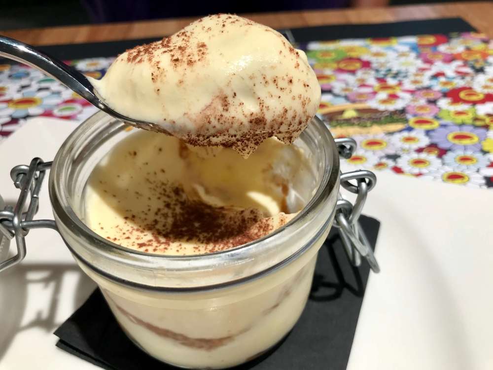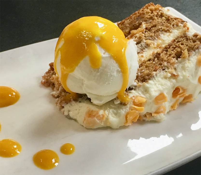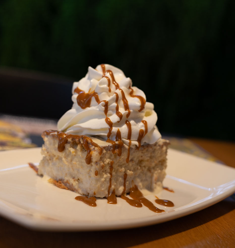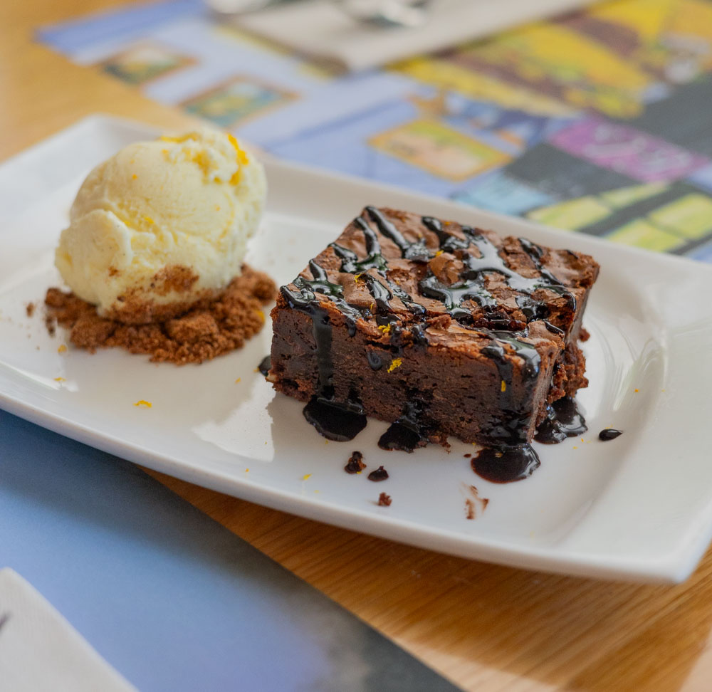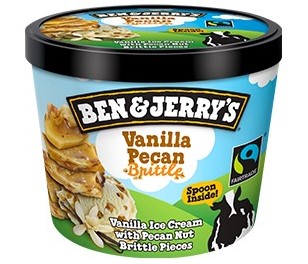 Helado de vainilla con trocitos de nueces de pecan, trocitos de brownie blanco y salsa de caramelo a la sal.​