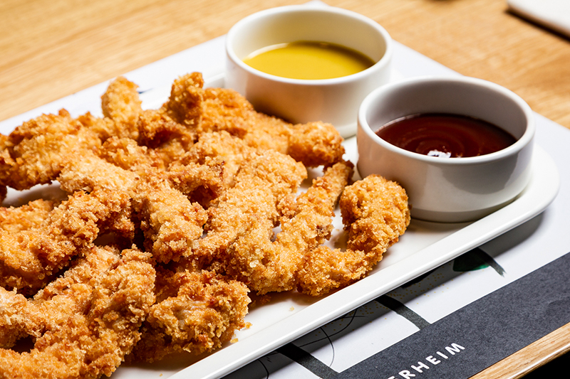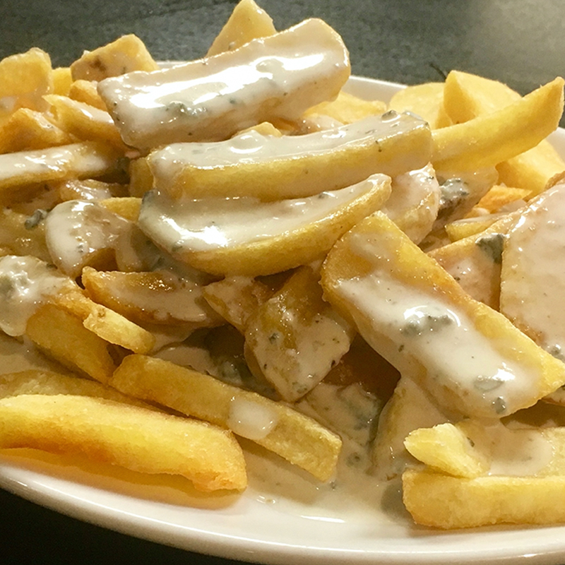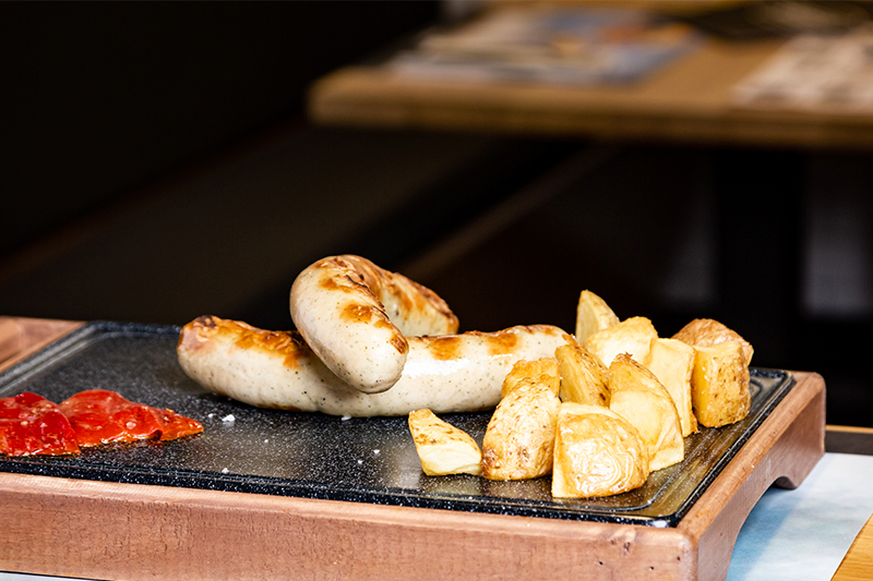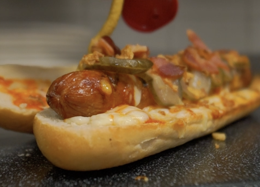 Pan artesano, cebolla crujiente, bacon bits, pepinillo agridulce, mezcla de quesos gratinados, salsa brava y  mostaza americana. Salchicha a elegir entre Bratwurst y Frankfurt. Incluye patatas.