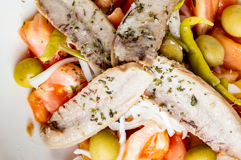 Tomata rosa, ventresca, cebolleta fresca, aceitunas y piparras