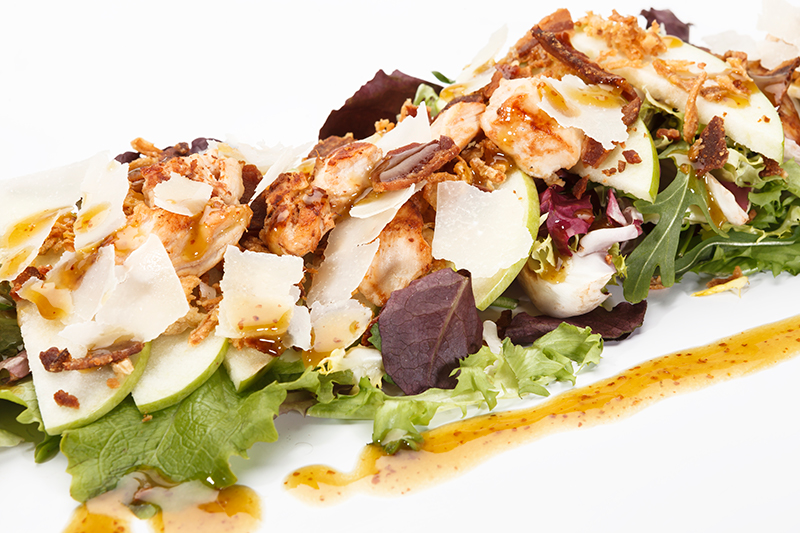 Mezcla de lechugas, dados de pollo teriyaki, polvo de bacon, manzana verde, cebolla crujiente y lascas de parmesano con vinagreta de mostaza y miel.
