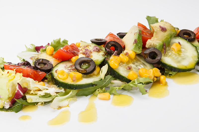 Mezclum de lechugas, dados de tomate, aguacate, cebolla fresca, maíz, pepino y aceitunas negras.