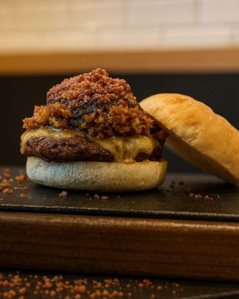 Carne burger La mestiza (mezcla de razas wagyu, Angus y rubia gallega), queso cheddar ahumado, relish de pepinillo y tomate seco. Salsa de tuétano asado, polvo de bacon y mayonesa de sriracha